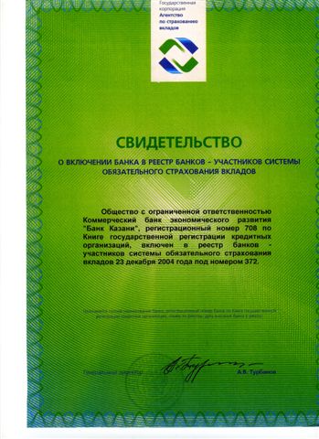 Свидетельство о включении Банка в реестр банков-участников системы обязательного страхования вкладов